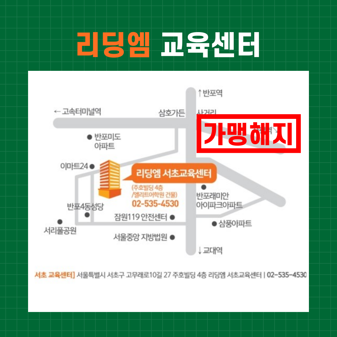 리딩엠 서초교육센터는 24년 8월 31일자로 가맹해지되었습니다.
