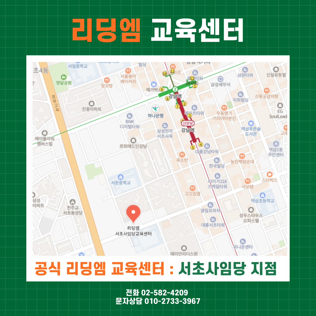 아울러, 서초구 지역에서 리딩엠 교육센터로 학생을 보내고 싶으신 학부모님께서는 아래 리딩엠 서초사임당 교육센터로 연락주시면 상담이 가능합니다.