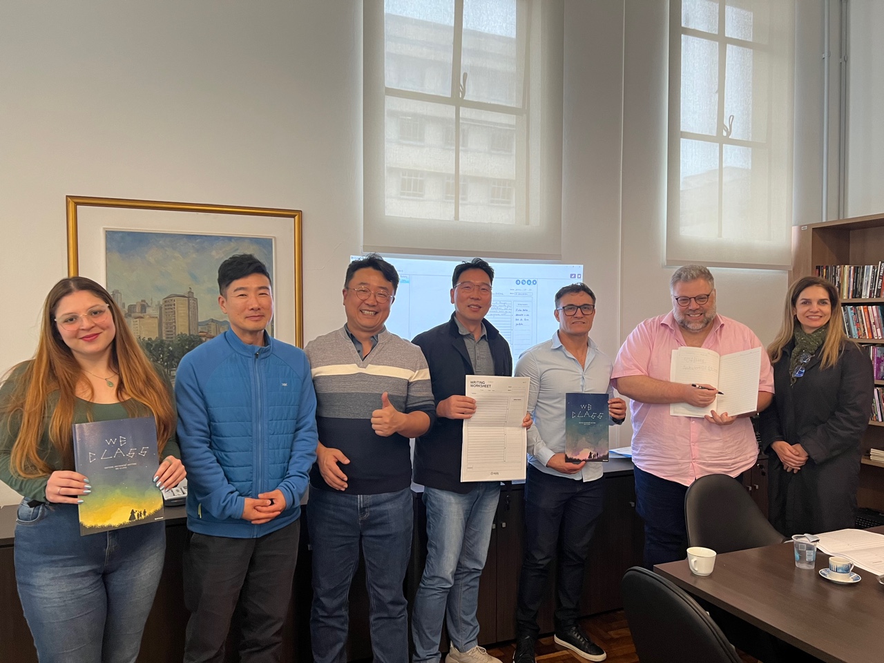 ▲ 2024년 10월 브라질 미팅 기념 사진 (리딩엠, 쿠리치바시 도서관장, 유핏)