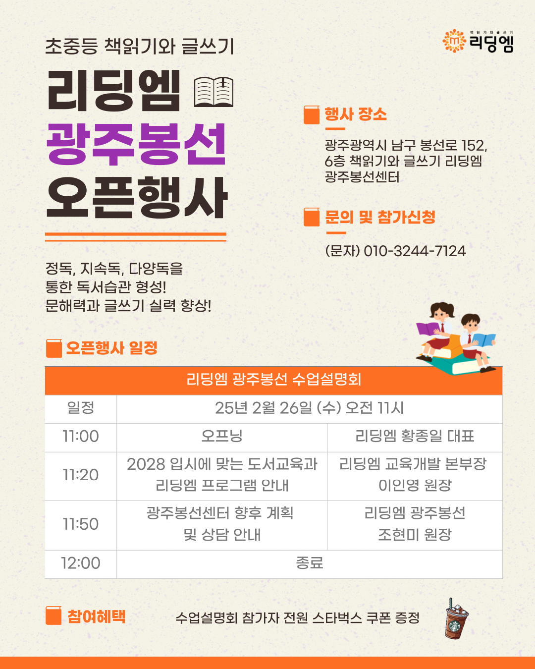 임민진 조선에듀 기자- 리딩엠이 광주광역시 봉선동에 교육센터를 오픈하고, ‘책읽기와 글쓰기, 대학도 보내준다고’라는 주제로 설명회를 진행한다.