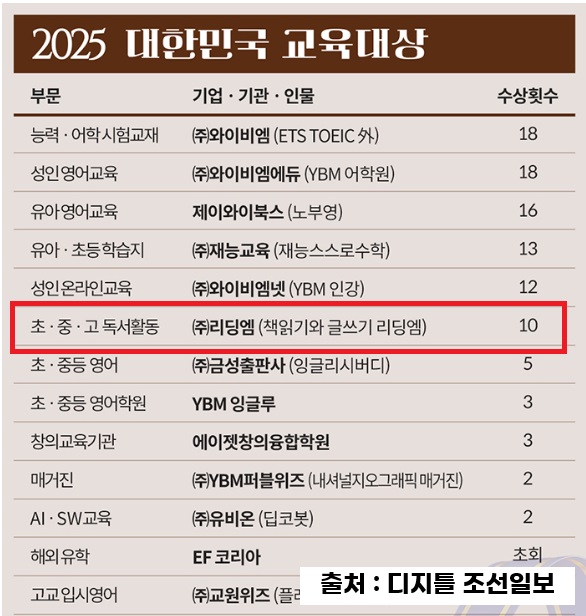 <2025년 대한민국 교육대상> 리딩엠 10년 연속 초중고 독서활동 부문 대상 수상