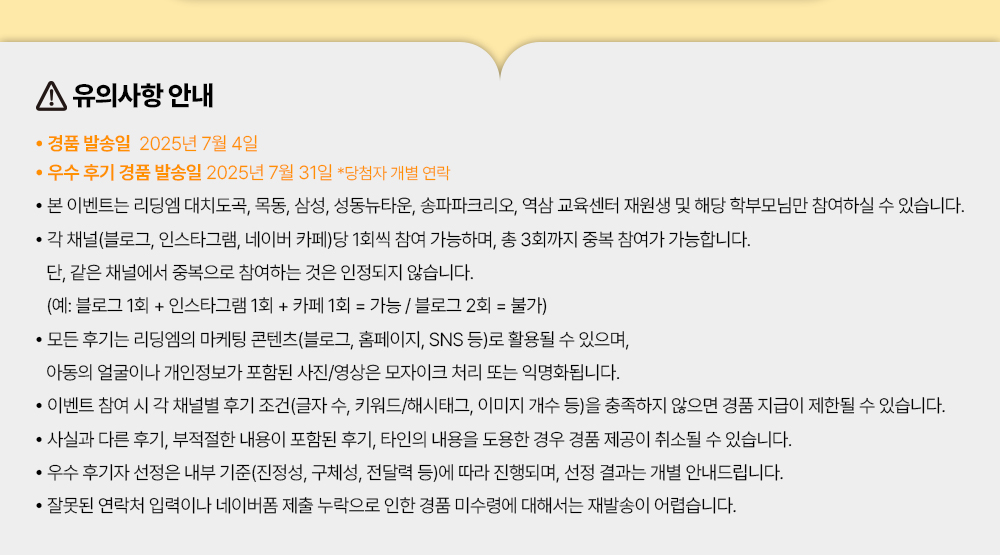 ※ 본 이벤트는 리딩엠 목동, 대치도곡, 삼성, 성동뉴타운, 송파파크리오, 역삼 교육센터만 참여합니다.