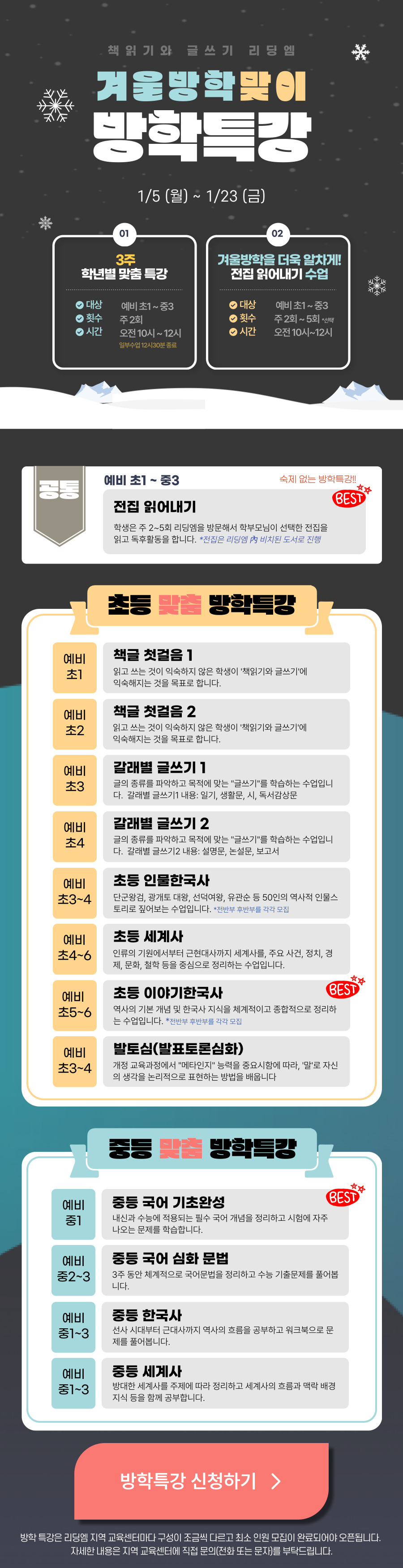 이외의 교육센터도 동알하게 겨울방학 특강을 운영합니다.